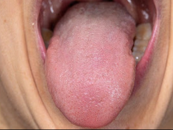 Antes: lengua con residuos, sequedad y desequilibrio bacteriano que causa mal aliento.